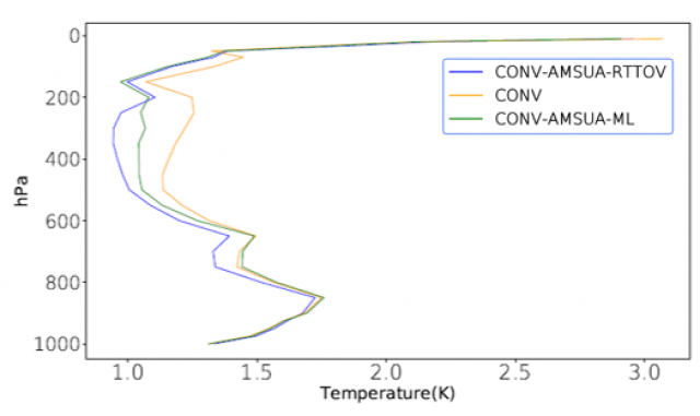 In data assimilation (DA), observation operator (OO) is required to convert model variables to model equivalent of the observations. Many OOs for satellite microwave brightness temperature (BT) from AMSU-A are based on radiative transfer model. Liang et al. (2022, under review) used machine learning as OO (ML-OO). Their work is summarized below. The DA system comprises NICAM model and LETKF. The Radiative Transfer for TOVS (RTTOV) is combined with bias correction as OO to assimilate BT (RTTOV-OO). The conventional observations and BT were assimilated for one month using this system. The forecast data during this period were paired with the observations to train neural network models (NNs) to obtained ML-OO. It was tested in the same month next year by conducting 3 experiments: conventional observations and BT were assimilated using RTTOV-OO (CONV-AMSUA-RTTOV); the same observations were assimilated but using ML-OO (CONV-AMSUA-ML); only conventional observations were assimilated (CONV). The RMS difference (RMSD) from ERA-interim for temperature were used to evaluate the performance. The temperature RMSD in CONV-AMSUA-ML is 2% higher than that in CONV-AMSUA-RTTOV but 4% lower than that in CONV. Therefore, ML-OO works well although it is slightly worse than RTTOV-OO. As ML-OO treats the biases internally, most of the channels have small biases. Two channels have larger biases, which is a result of significant change in the satellite characteristics. If the change is small, ML-OO doesn’t require a separate bias correction procedure so that the DA system design is simplified.
